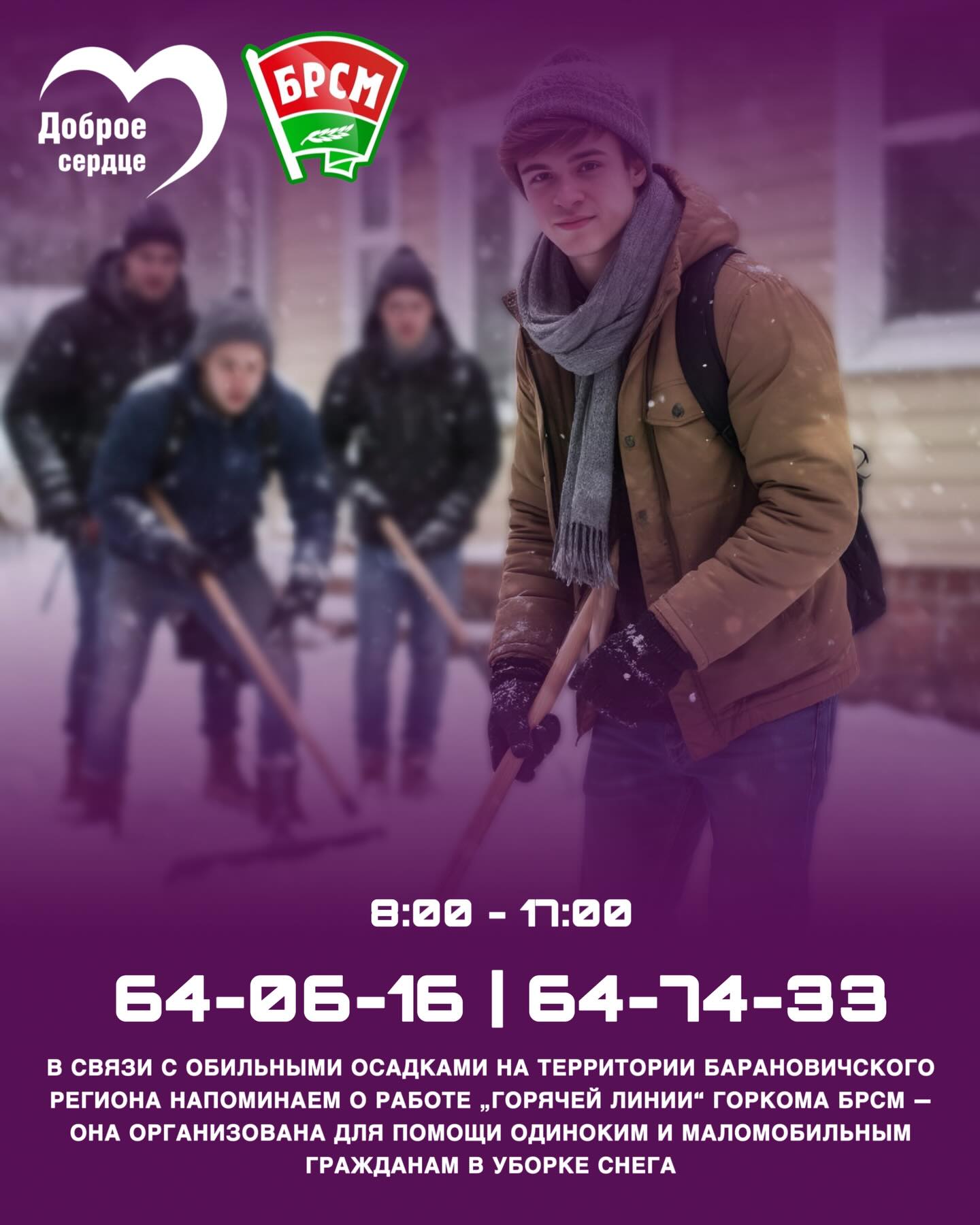 Волонтёры движения «Доброе Сердце» готовы оказать помощь в уборке снега одиноким и маломобильным гражданам.